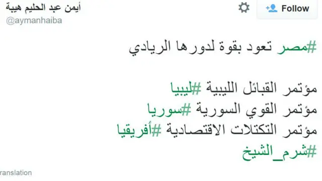 وأثنى آخرون على النشاط الذي تقوم به مصر في القضايا الإقليمية والأفريقية، واستضافة مؤتمر القبائل الليبية ومؤتمر المعارضة السورية وأخيرا مؤتمر التكتلات الاقتصادية في أفريقيا.