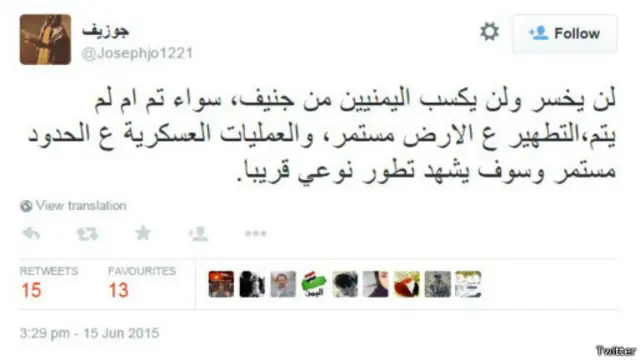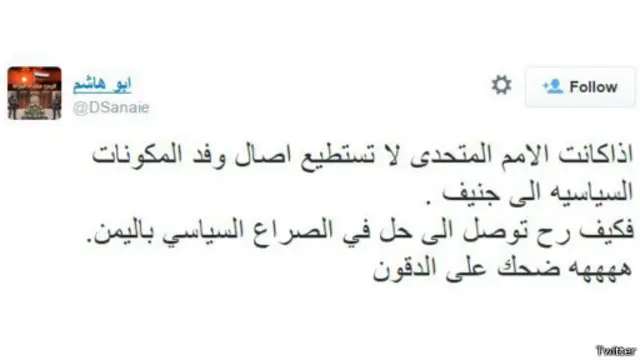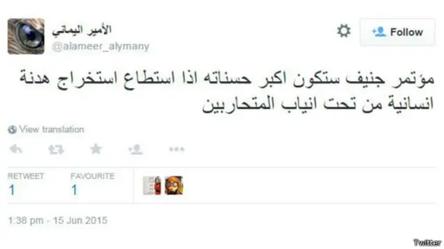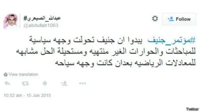 انشغل مستخدمو تويتر في عدد من الدول العربية ابرزها السعودية واليمن بمؤتمر جنيف الذي بدأ الاثنين 15 يونيو / حزيران بهدف حل الصراع في اليمن بين أنصار الرئيس عبد ربه منصور هادي الموجود خارج البلاد من جهة، وجماعات الحوثيين المسلحين ومؤيدي الرئيس الأسبق على عبد الله صالح من جهة أخرى.