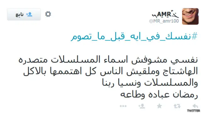 وأضاف المستخدم "عمرو": "#نفسك_في_ايه_قبل_ما_تصوم نفسي مشوفش أسماء المسلسلات متصدرة الهاشتاج، وملقيش الناس كل اهتممها بالأكل والمسلسلات ونسيا ربنا. رمضان عبادة وطاعة".