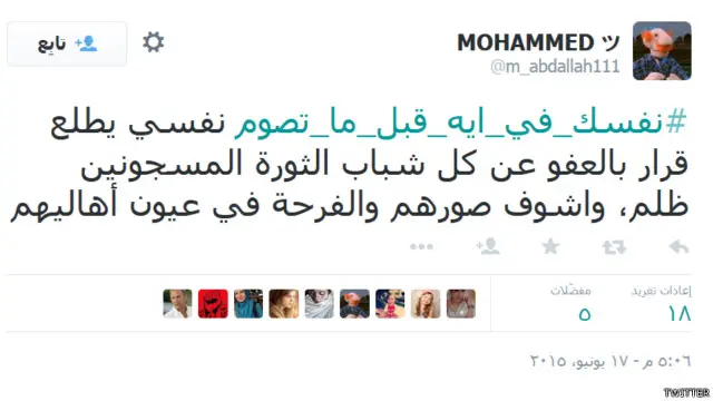 أما المغرد "محمد" اختار أن تكون أمنيته لـ "سجناء الثورة" كما وصفهم، وقال: "#نفسك_في_ايه_قبل_ما_تصوم نفسي يطلع قرار بالعفو عن كل شباب الثورة المسجونين ظلم، وأشوف صورهم والفرحة في عيون أهاليهم".