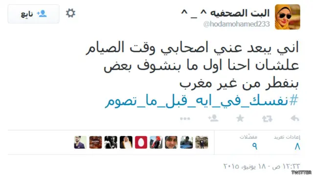 وبنبرة ساخرة، قالت المستخدمة التي أطلقت على نفسها اسم "البنت الصحفية": "إن يبعد عني أصحابي وقت الصيام، علشان إحنا أول ما بنشوف بعض بنفطر من غير مغرب".