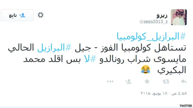 ويقول المستخدم زيزو في حسابه على تويتر: "#البرازيل_كولومبيا تستاهل كولومبيا الفوز، جيل #البرازيل الحالي ما يسوى شراب رونالدو. لا بس أقلد محمد البكيري".