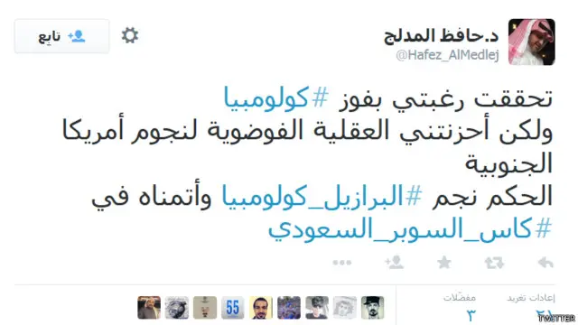 وهنأ د.حافظ المدلج منتخب كولومبيا في تعليق له: "تحققت رغبتي بفوز #كولومبيا، لكن أحزنتني العقلية الفوضوية لنجوم أمريكا الجنوبية. الحكم نجم #البرازيل_كولومبيا وأتمناه في #كاس_السوبر_السعودي".