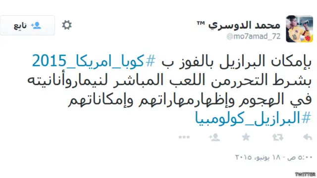 ويشير محمد الدوسري إلى أسباب خساة البرازيل في المباراة، ويقول: "بإمكان البرازيل بالفوز بـ #كوبا_أمريكا_2015 بشرط التحررمن اللعب المباشر لنيمار وأنانيته في الهجوم، وإظهارمهاراتهم وإمكاناتهم #البرازيل_كولومبيا".