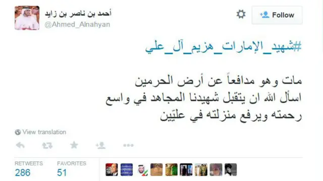 نعى مغردون إماراتيون وخليجيون الجندي الإماراتي هزيم عبيد آل علي، الذي توفي أثناء حادث تدريب، ضمن القوات العربية المشاركة في عملية إعادة الأمل، التي تقودها السعودية.