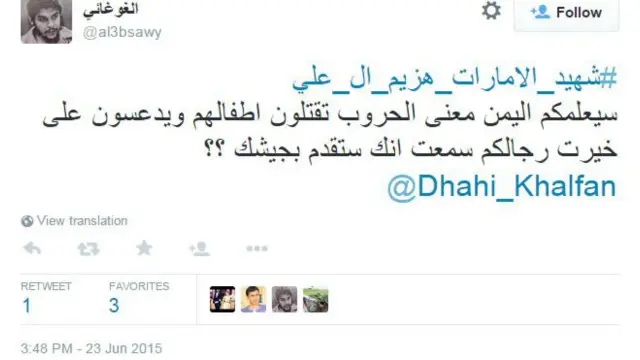 لم تخل تغريدات البعض من التنديد بالدول المشاركة في التحالف ضد الحوثيين في اليمن، من بينهم المغرد "الغوغائي" الذي كتب يقول "سيعلمكم اليمن معنى الحروب تقتلون اطفالهم ويدعسون على خيرت رجالكم سمعت انك ستقدم بجيشك؟"