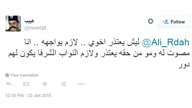 ووصف مغرد يطلق على نفسه اسم "لا تسيسون السياسة" فرضية اعتذار العازمي بـ "العار له ولمن انتخبه"، وكتب قائلا "اذا اعتذر حمدان العازمي فهذه تعتبر عار عليه وعلى من صوت له".