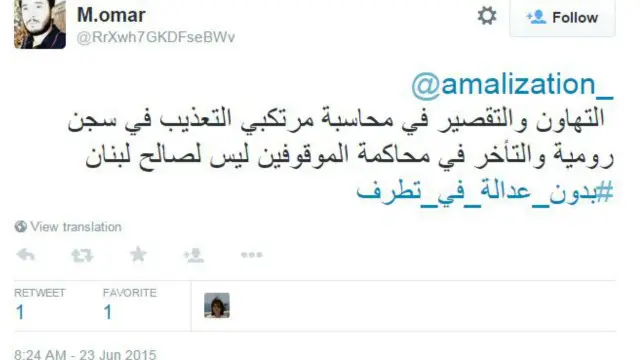 ودعا مغردون إلى إنهاء ملف الموقوفين الإسلامين في سجن رومية، محذرين من مغبة التهاون في محاسبة المسؤولين عن التعذيب، قد تؤدي لمزيد من العنف.