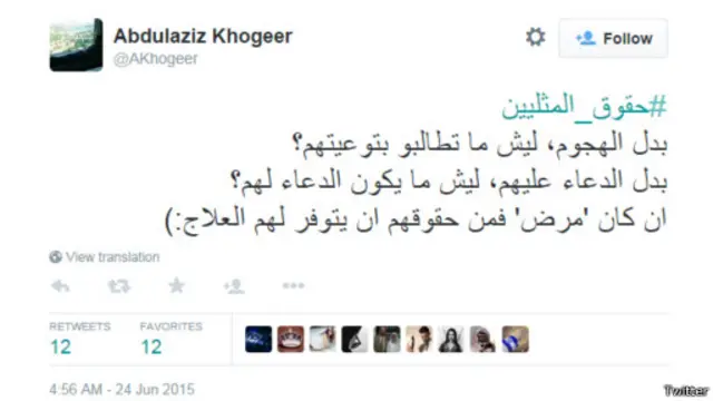 وغردت المدونة ضاوي الشمري منتقدة : "السعودية أظهرت رأيها حتى في المثليين في حين انها ما زالت مكتمة على رأيها في حقوق المرأة!"
