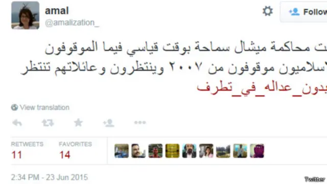 ووصف المغرد طارق أبو صالح مايحدث بـ "اختلال في ميزان العدالة"، وقال في تغريدة له "(الوزير السابق) ميشال سماحة كان بدو يفجر البلد انحكم 3 سنين! وشباب دافعوا عن حالهم من بعد ما اتخلت عنهم الدولة صرلهم سنين بلا محاكمات".