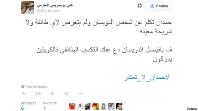 تفاعل مغردون مع هاشتاغ #حمدان_لا_تعتذر ، وذلك بعد سجال دار بين النائبين فيصل الدويسان وحمدان العازمي وهو سجال وصف بالطائفي.
