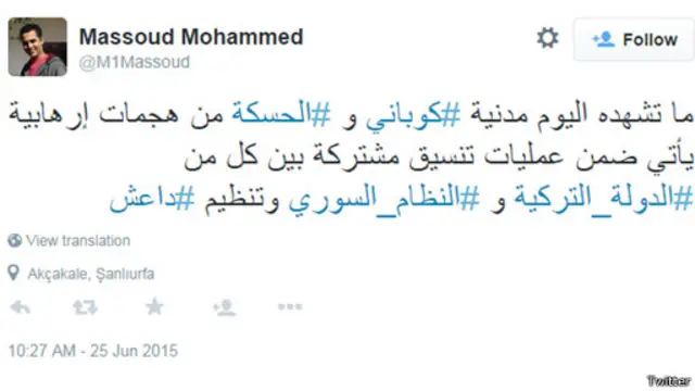 وألقى مغردون باللائمة على تركيا لـ "تسهيل هجمات عناصر تنظيم الدولة الإسلامية على كوباني" وذلك بالسماح لهم بالمرور عبر الحدود التركية، حسب قولهم.