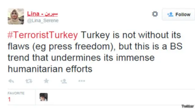 فغردت المدونة سيرين قائلة: "تركيا ليست دولة مثالية، ولكن هذا الهاشتاغ يعتبر هراء وقد يكون له تأثيرا سلبيا على الجهود الإنسانية الهائلة التي تقوم بها الدولة التركية لمساعدة اللاجئين".