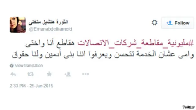فغردت المدونة " إيمان عبد المعين" قائلة : " أستخدم الإنترنت طول الوقت ولكني سأقطعها اليوم، لكي تعلم شركات الاتصال إن النت بمزاجنا مش بمزاجهم ودفع القيمة=خدمة تستاهل."