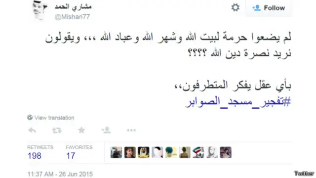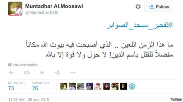 وجاءت التغريدات لتستنكر الهجوم، وتدين تنظيم الدولة الإسلامية بشدة، خاصة إذ ان التفجير قد استهدف مسجدا اثناء صلاة الجمعة، وخلال شهر رمضان.