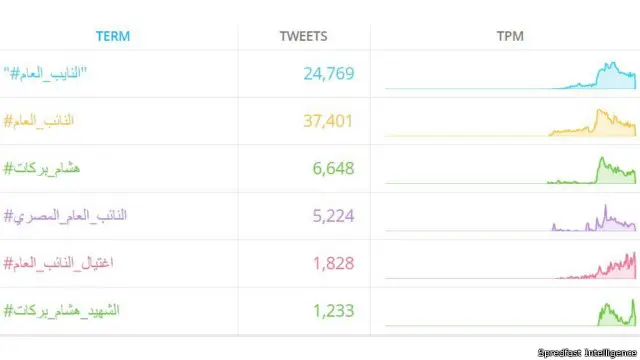 ومع إعلان خبر وفاة بركات متأثرا بجروح اصيب بها، ازداد اهتمام مستخدمي تويتر بالموضوع ليفوق عدد الهاشتاغات المتابعة للموضوع 10 هاشتاغات أبرزها #النائب_العام و هاشتاغ #هشام_بركات، كما شارك مغردون من دول عربية مختلفة مثل السعودية والكويت الحديث عن الخبر أيضاً.
