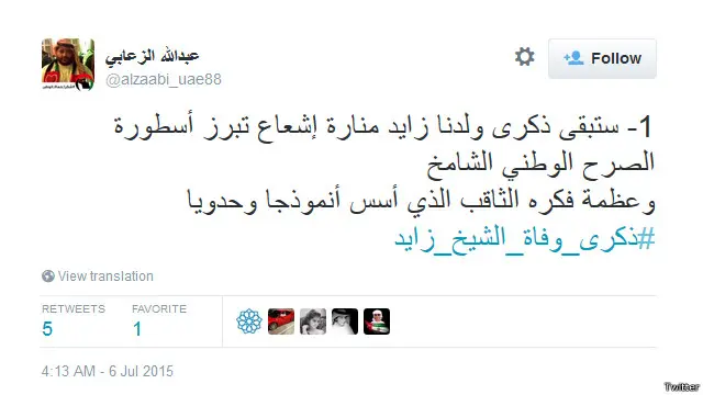 اهتم مغردون إماراتيون بإحياء ذكرى وفاة الشيخ زايد بن سلطان آل نهيان الذي توفي في 19 رمضان عام 1425 هجرية (2 نوفمبر/تشرين الثاني 2004).