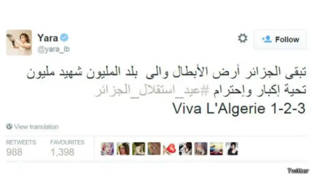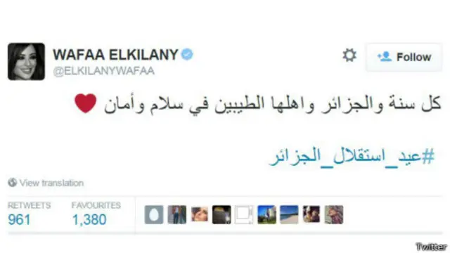 وننتقل الى الجزائر حيث دشن مستخدمو تويتر عدداً من الهاشتاغات أبرزها هاشتاغ #عيد_استقلال_الجزائر وذلك بمناسبة الذكرى 53 لاستقلال الجزائر عن فرنسا الذي وافق يوم الأحد 5 يوليو / تموز.