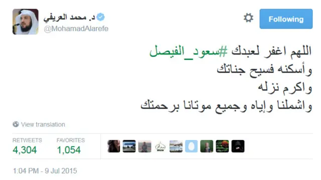 كما نعاه الداعية السعودي محمد العريفي، وكتب: "اللهم اغفر لعبدك #سعود_الفيصل وأسكنه فسيح جناتك وأكرم نزله واشملنا وإياه وجميع موتانا برحمتك".