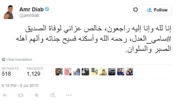 ونعى المطرب المصري عمرو دياب على حسابه بموقع تويتر الفنان الراحل، وكتب: "إنا لله وإنا إليه راجعون، خالص عزائي لوفاة الصديق #سامي_العدل، رحمه الله وأسكنه فسيح جناته وألهم أهله الصبر والسلوان".