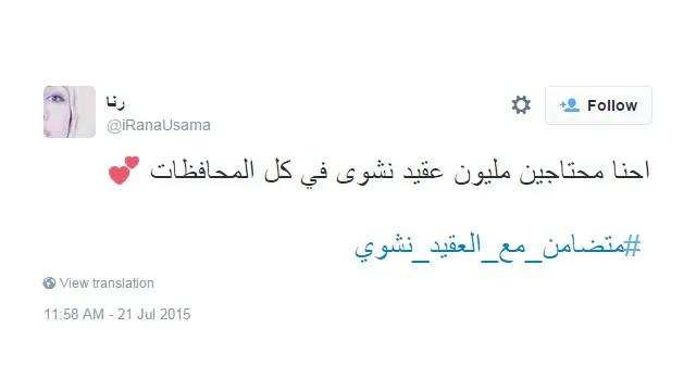 دشن المستخدمون على موقع التواصل الاجتماعي تويتر في مصر هاشتاغ #متضامن_مع_العقيد_نشوى تعبيرا عن استياءهم من الانتقادات التي وُجهت لإحدى الشرطيات المصريات أثناء التعامل مع أحد المتحرشين في شوارع مصر.