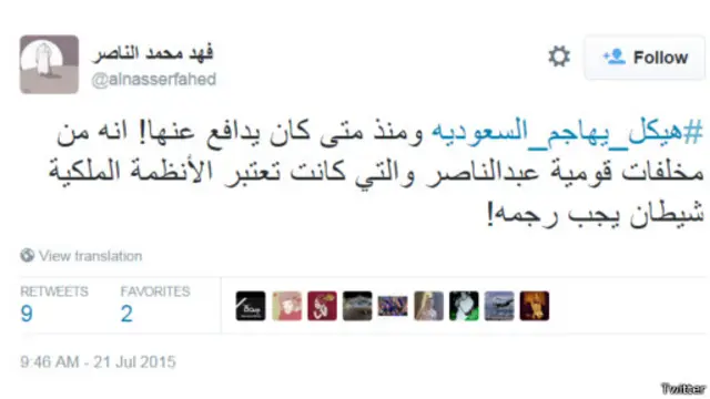 بينما رأى عدد آخر من المغردين أن هيكل طالما انتقد السعودية، ووصفوه بالناصري، في إشارة إلى الرئيس المصري الراحل جمال عبد الناصر المعروف "بعدائه للمملكة العربية السعودية".