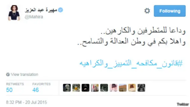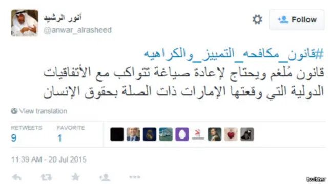 وغرد سلطان العميمي، مرحبا بالقانون الجديد :" مؤخراً ارتفعت للأسف أصوات تحمل نبرة تحريضية طائفية، تحت غطاء ديني وآخر وطني. وصدور #قانون_مكافحة_التمييز_والكراهية سيضع حداً لهذه الأصوات."