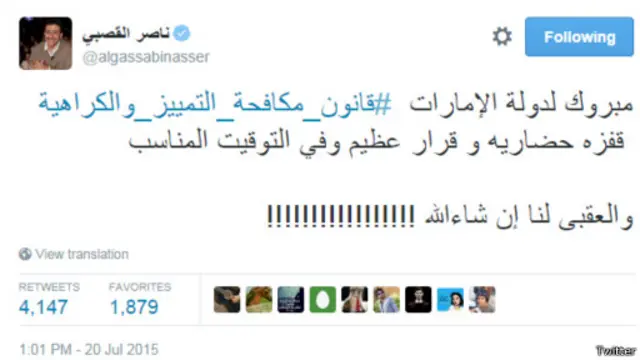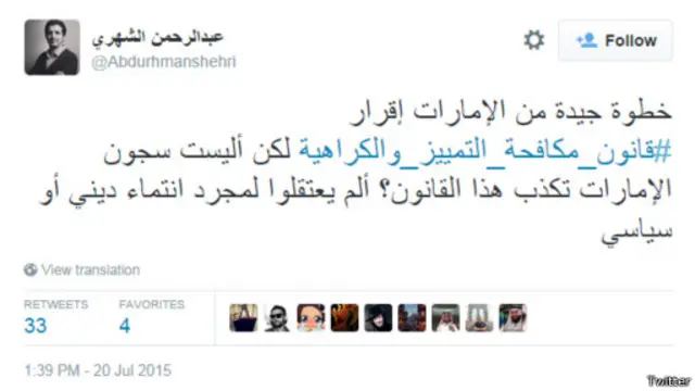 وتحت هاشتاغ #قانون_مكافحة_التمييز_والكراهية، تباينت آراء المغردين الإماراتيين حول القانون الجديد، ليصل بذلك عدد التغريدات إلى أكثر من 40 ألف تغريدة.