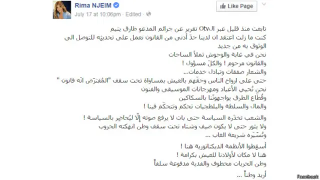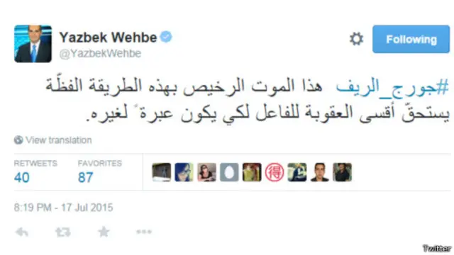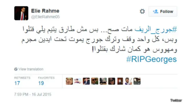 وأضافت الإعلامية اللبنانية راغدة معلولي في تغريدة لها : " #جورج_الريف ضحية الفلتان الأمني والعهر السياسي وشريعة الغاب في #لبنان."