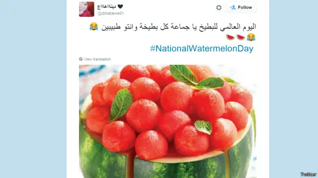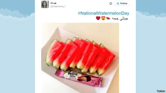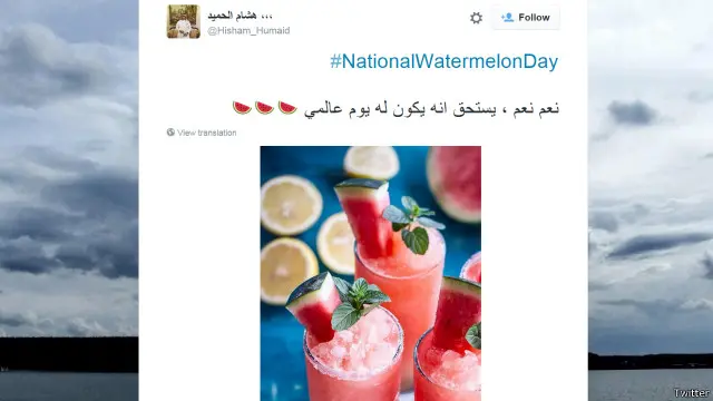 وظهر هاشتاغ #NationalWatermelonDay في أكثر من ستين الف تغريدة، منها اكثر من الفين باللغة العربية.