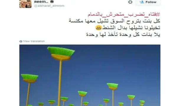 تفاعل مغردون مع هاشتاغ #فتاه_تضرب_متحرش_بالدمام بعد انتشار فيديو على تويتر ويوتيوب تظهر فيه امرأة تضرب رجلاً بمكنسة. وبحسب التعليقات التي كُتبت فقد تحرش الرجل بالسيدة في سوق بالدمام، ما دفعها الى اللحاق به وضربه.