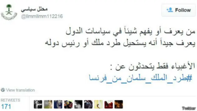 أثار هاشتاغ #طرد_الملك_سلمان_من_فرنسا غضباً واسعاً بين مستخدمي تويتر في السعودية. وكان الهاشتاغ قد ظهر بعد قطع العاهل السعودي عطلته في الريفيرا الفرنسية، إثر جدل بشأن إغلاق جزء من الشاطئ لتأمين إقامته.