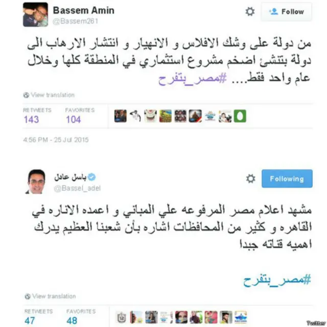 وعبر مغردون مصريون عن فرحتهم بإنتهاء المشروع وبالجهود التي تقوم بها الحكومة المصرية لتحسين الوضع الاقتصادي في البلاد.