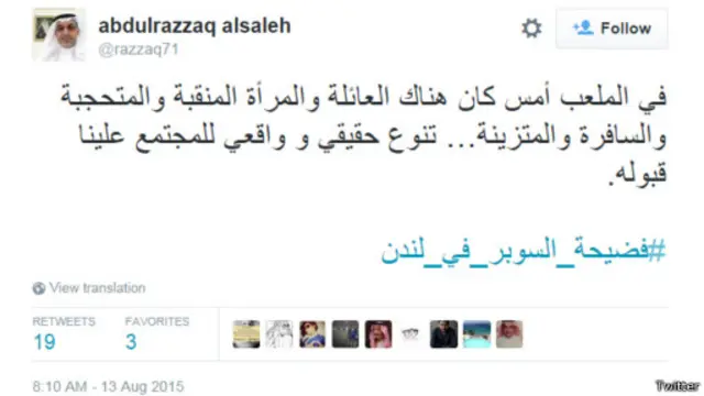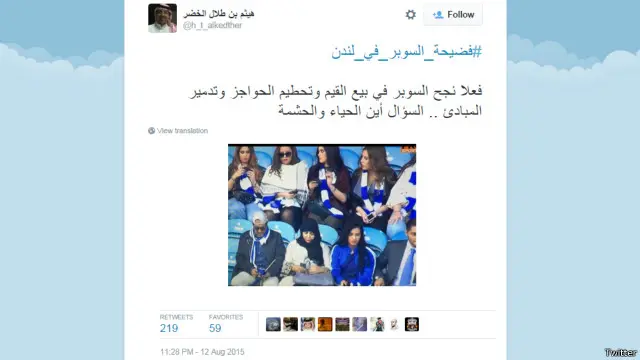وانتشر هاشتاغ #فضيحة_السوبر_في_لندن، الذي عبر من خلاله عدد من المغردين عن غضبهم تجاه مخرج المباراة الذي اتهموه بالتركيز على ما وصفوهم بالنساء "المتبرجات" السعوديات من مدرجات جماهير المباراة.