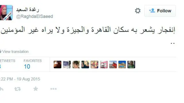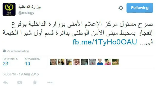 وتبنى ما يسمى بتنظيم ولاية سيناء، التابع لتنظيم الدولة الإسلامية، التفجير في بيان له نشر عبر تويتر. يمكنكم الإطلاع على المزيد من التفاصيل حول التفجير <link type="page"><caption> هنا</caption><url href="http://www.bbc.com/arabic/middleeast/2015/08/150819_egypt_cairo_shubra_explosion" platform="highweb"/></link>.
