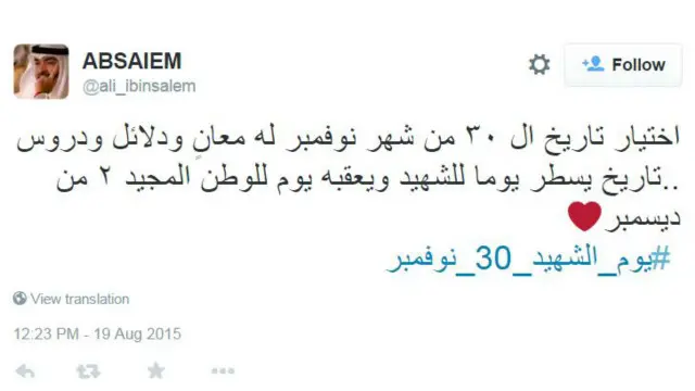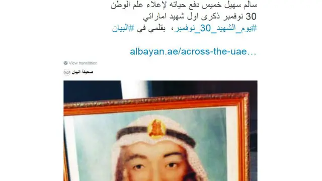 أعلنت دولة الإمارات العربية المتحدة عن اختيار يوم 30 نوفمبر/تشرين الثاني من كل عام يوما لـ"الشهيد"، واعتباره إجازة رسمية على مستوى الدولة.