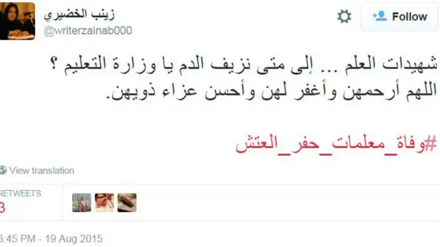 وحظي الحادث باهتمام بالغ من المتابعين، وظهر هاشتاغ #وفاه_معلمات_حفر_العتش في أكثر من 62 ألف تغريدة.