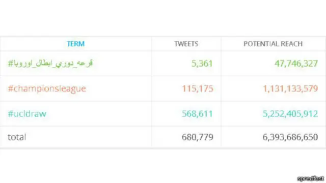 وفاق إجمالي عدد التغريدات التي تطرقت إلى حديث عن قرعة دوري أبطال أوروبا 600 ألف تغريدة، وظهر الهشتاغ #قرعه_دوري_ابطال_اوروبا، في أكثر من 5 ألاف تغريدة.