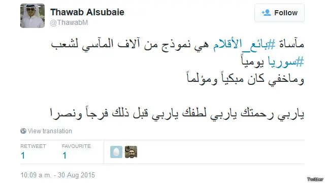 تداول مغردون هاشتاغ #بائع_الأقلام، لمناقشة حملة لجمع تبرعات للاجيء سوري في بيروت يدعى عبدالحليم العطار، وهي الحملة التي جمعت أكثر من 131 ألف دولار في يومين.
