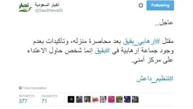 تداول مغردون هذا الهاشتاغ، بعد تداول أنباء أفادت بأن قوات الأمن تحاصرا إرهابيا من تنظيم الدولة (داعش) في مدينة بقيق شرقي البلاد، عقب إطلاقه النار على نقطة أمنية.