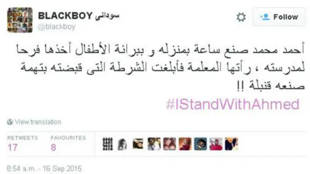 تصدر هاشتاغ بعنوان "#IStandWithAhmed" أو "أتضامن مع أحمد" قائمة الهاشتاغات الأكثر تداولا على توتير حول العالم.