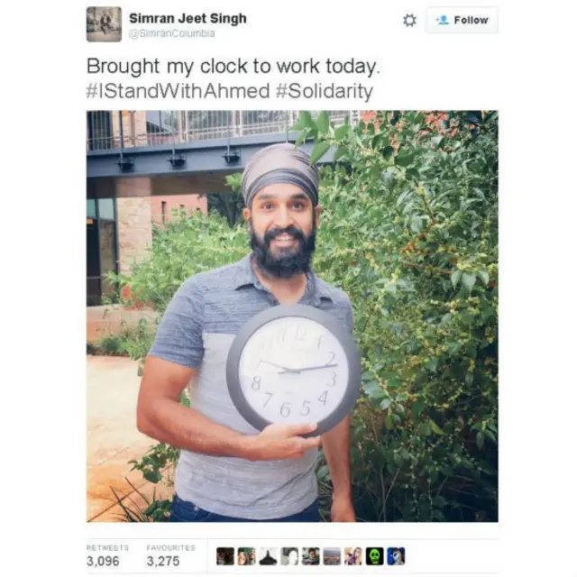 كما نشر نشطاء حول العالم صورا وهم يحملون ساعات تعبيرا عن تضامنهم مع أحمد.