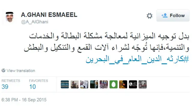 وتداول المغردون هاشتاغ #كارثه_الدين_العام_في_البحرين، الذي ظهر في نحو سبعة الاف تغريدة، عبر من خلاله المستخدمون عن استيائهم من الأزمة الاقتصادية التي تشهدها البحرين، وتناولوا الأسباب التي برأيهم افضت إلى الوضع الحالي.