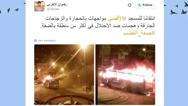 وننتقل إلى الأحداث في القدس، إذ اهتم مستخدمو مواقع التواصل الاجتماعي في العالم العربي بالاشتباكات التي وقعت بين متظاهرين فلسطينيين وقوات الأمن الاسرائيلية، والمسيرات المتوقع خروجها اليوم فيما سمي على مواقع التواصل بـ"جمعة الغضب".