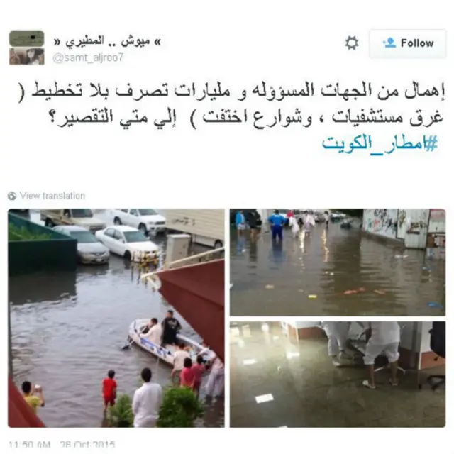 وعلى إثرها، انتشرت على مواقع التواصل الإجتماعي، صور لشوارع غمرتها الأمطار والأضرار التي خلفتها، في مشهد أثار استغراب الكويتيين، وتباينت تعليقاتهم بين الفرح والغضب وانتقاد المسؤولين، فيما اتخذت تغريدات أخرى السخرية وسيلة للتعبير عن الرأي.