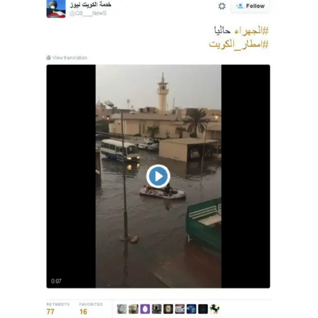 كما أظهرت مقاطع فيديو، جرى تداولها على مواقع التواصل الاجتماعي، عدداً من شوارع الكويت غارقة في مياه الأمطار، وأخرى تظهر لجوء البعض للقوارب المطاطية للتنقل داخل مدينة الجهراء.