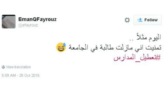 وسخر العديد من المغردين من تعطيل الدوام في المدارس والجامعات بسبب تردي الأحوال الجوية، بينما أعرب آخرون عن سعادتهم لذلك.