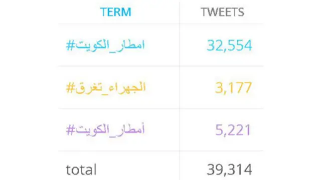 ويظهر الرسم التوضيحي أسفله الهاشتاغات المستخدمة في نقل وتغطية الأحوال الجوية التي تشهدها الكويت.