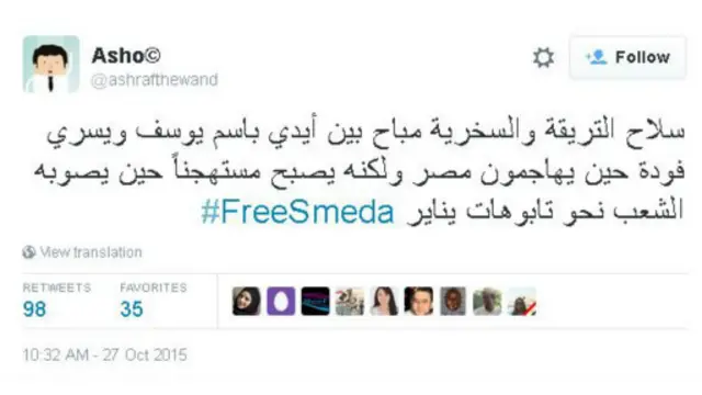 انتشر هاشتاغ بعنوان #FreeSmeda بين أوساط مستخدمي موقع تويتر في مصر، ردا على ماوصفوه بالتضخيم الإعلامي لـحملة #FreeAlaa المطالبة بالافراج عن علاء عبد الفتاح الناشط والمدون المصري، المحكوم عليه بالسجن 5 سنوات لإدانته في القضية المعروفة إعلاميا بـ"أحداث مجلس الشورى".