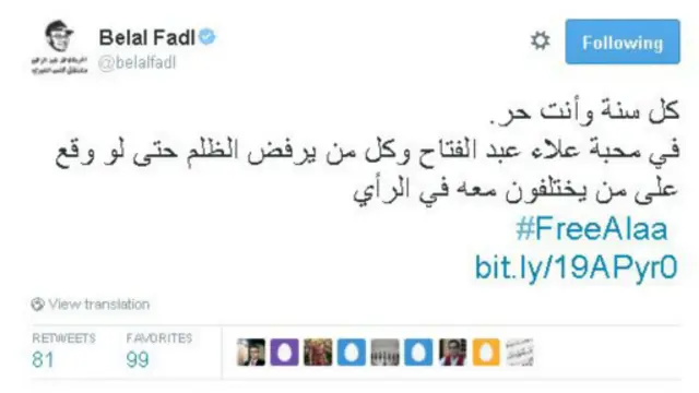 فقد نظم نشطاء أمس الثلاثاء وفقة تضامنية تحت شعار "الحرية لعلاء" وذلك بعد مرور عام على حبسه، للتذكير بقضيته، لتتحول الوفقة افتراضيا إلى مجموعة هاشتاغات تضامنية مع سجناء الرأي العام، لعل أبرزها #freeAlaa الذي ظهر في أكثر من 30 ألف تغريدة.
